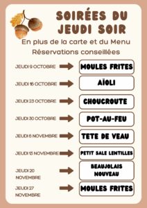 Nous vous proposons une soirée à thème tous les jeudis soirs, n’hésitez pas à consulter notre page Facebook :